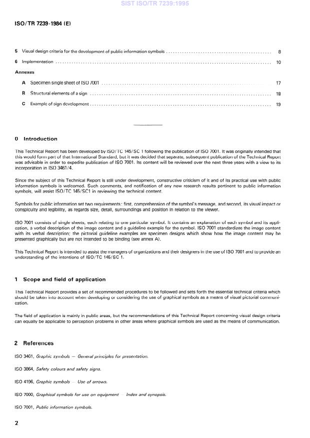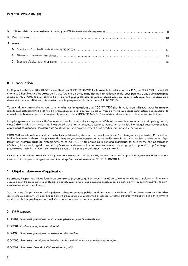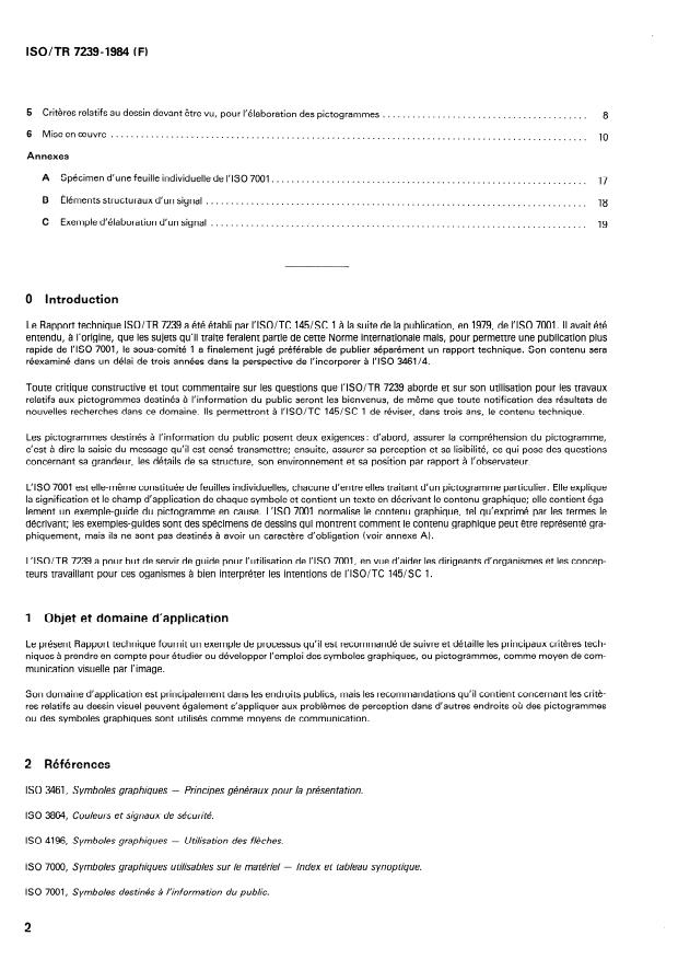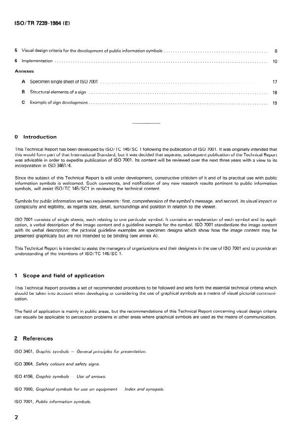 ISO/TR 7239:1984 is a technical report published by the International Organization for Standardization (ISO). Its full title is "Development and principles for application of public information symbols". This standard covers: Provides a set of recommended procedures to be followed and sets forth the essential technical criteria which should be taken into account when developing or considering the use of graphical symbols as a means of visual pictorial communication. Applies mainly to public areas. Includes terms and definitions.