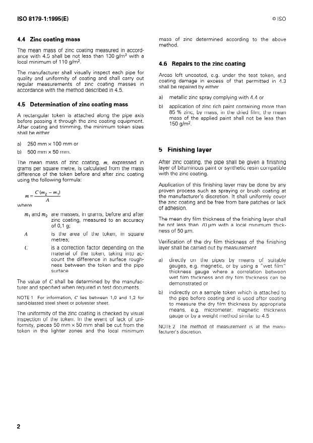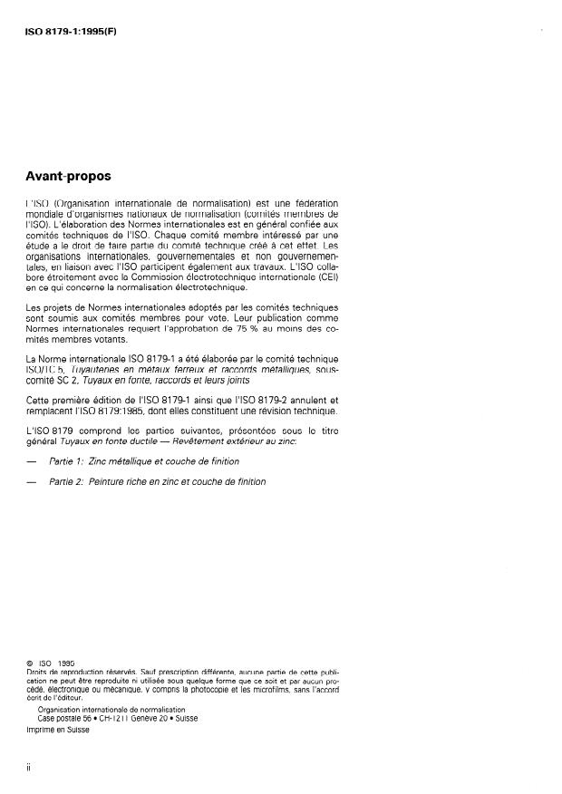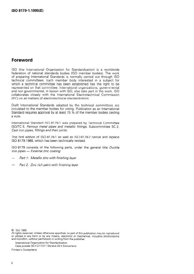 ISO 8179-1:1995 is a standard published by the International Organization for Standardization (ISO). Its full title is "Ductile iron pipes — External zinc coating — Part 1: Metallic zinc with finishing layer". This standard covers: Deals with a factory-applied protective external coating system for centrifugally cast ductile iron pipes. This coating system comprises a metallic zinc layer followed by a bituminous paint as finishing layer. This edition replaces ISO 8179, which has been technically revised.