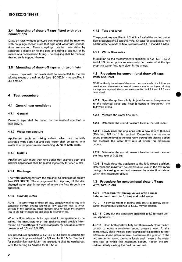 ISO 3822-2:1984 is a standard published by the International Organization for Standardization (ISO). Its full title is "Acoustics — Laboratory tests on noise emission from appliances and equipment used in water supply installations — Part 2: Mounting and operating conditions for draw-off taps". This standard covers: Acoustics — Laboratory tests on noise emission from appliances and equipment used in water supply installations — Part 2: Mounting and operating conditions for draw-off taps