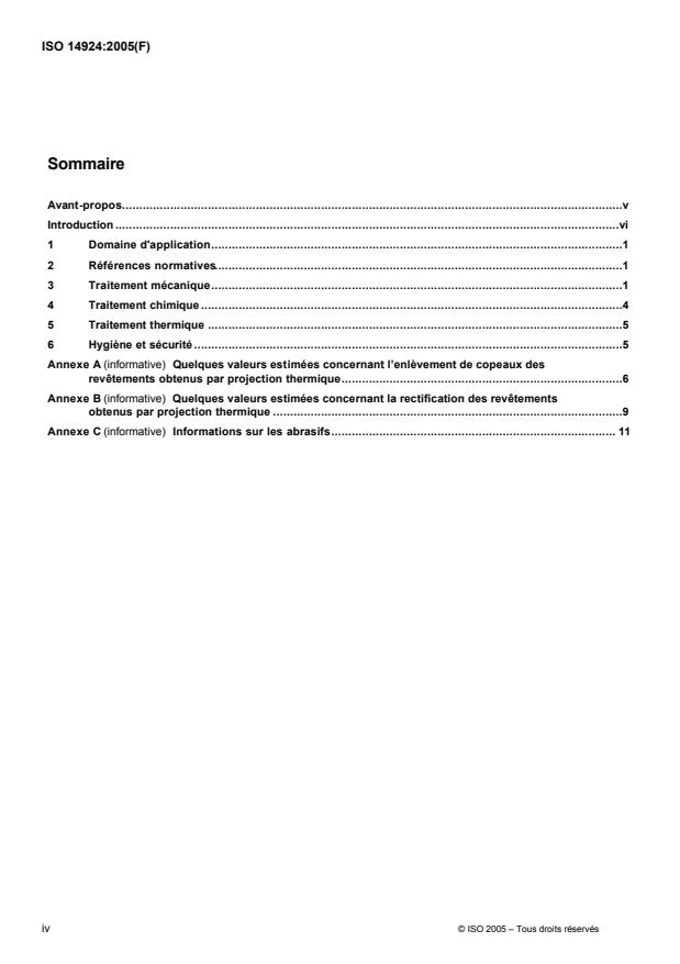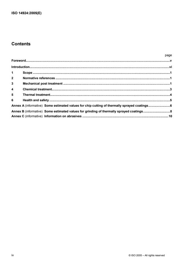 L'ISO 14924:2005 spécifie le traitement et la finition des revêtements obtenus par projection thermique. Elle est applicable aux différents types de traitements mécaniques, chimiques et thermiques comprenant l'élimination des copeaux et d'autres procédés mécaniques de colmatage, de décapage, de peinture, de fusion, de recuit de diffusion et de compression isostatique à chaud.