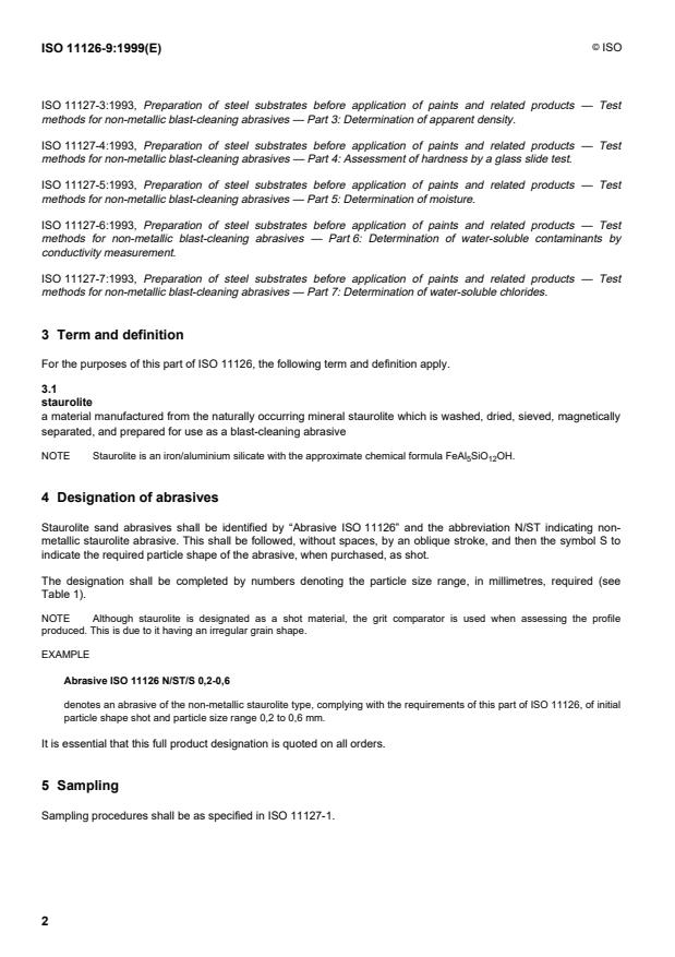 ISO 11126-9:1999 is a standard published by the International Organization for Standardization (ISO). Its full title is "Preparation of steel substrates before application of paints and related products - Specifications for non-metallic blast-cleaning abrasives - Part 9: Staurolite". This standard covers: This part of ISO 11126 specifies requirements for staurolite abrasives, as supplied for blast-cleaning processes. It specifies ranges of particle sizes and values for apparent density, Mohs hardness, moisture content, conductivity of aqueous extract and water-soluble chlorides. The requirements specified in this part of ISO 11126 apply to abrasives supplied in the "new" condition only. They do not apply to abrasives either during or after use. Test methods for non-metallic blast-cleaning abrasives are given in the various parts of ISO 11127. NOTE 1 Information on commonly referenced national standards for non-metallic abrasives is given in annex A. NOTE 2 Although this part of ISO 11126 has been developed specifically to meet requirements for preparation of steelwork, the properties specified will generally be appropriate for use when preparing other material surfaces, or components, using blast-cleaning techniques. These techniques are described in ISO 8504-2:1992. Preparation of steel substrates before application of paints and related products - Surface preparation methods - Part 2: Abrasive blast-cleaning.