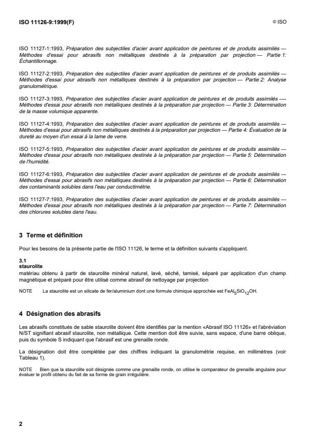 La présente partie de l'ISO 11126 prescrit des exigences s'appliquant aux abrasifs constitués de staurolite, utilisés pour les procédés de décapage par projection. Elle spécifie des gammes pour les granulométries et les valeurs de la masse volumique apparente, de la dureté Mohs, de l'humidité, de la conductivité de l'extrait aqueux et de la teneur en chlorures solubles dans l'eau. Les exigences spécifiées dans la présente partie de l'ISO 11126 s'appliquent seulement aux abrasifs fournis à l'état neuf. Elles ne s'appliquent pas aux abrasifs pendant ou après utilisation. Les méthodes d'essai s'appliquant aux abrasifs non métalliques utilisés pour le décapage par projection sont décrites dans les diverses parties de l'ISO 11127. NOTE 1 L'annexe A donne des informations sur les normes nationales couramment citées en référence pour les abrasifs non métalliques. NOTE 2 La présente partie de l'ISO 11126 a été spécialement élaborée pour satisfaire aux exigences de préparation des tôleries; cependant, les propriétés prescrites seront généralement appropriées pour l'emploi en préparation des subjectiles ou éléments constitués d'autres matériaux, selon les techniques de décapage par projection. Ces techniques sont décrites dans l'ISO 8504-2:1992, Préparation des subjectiles d'acier avant application de peintures et de produits assimilés — Méthodes de préparation des subjectiles — Partie 2: Décapage par projection d'abrasif.