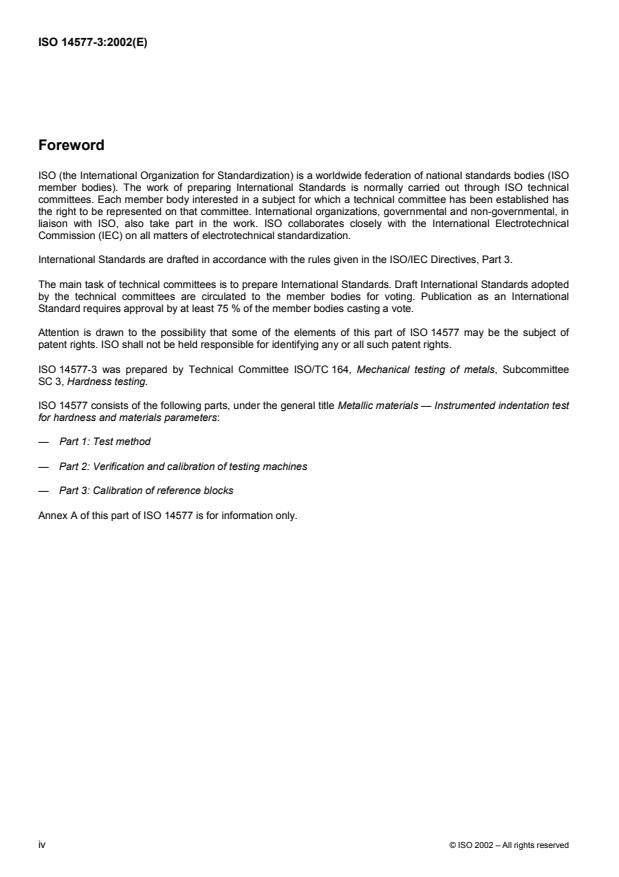 ISO 14577-3:2002 is a standard published by the International Organization for Standardization (ISO). Its full title is "Metallic materials — Instrumented indentation test for hardness and materials parameters — Part 3: Calibration of reference blocks". This standard covers: ISO 14577-3 specifies a method for the calibration of reference blocks to be used for the indirect verification of testing machines for the instrumented indentation test, as specified in ISO 14577-2.