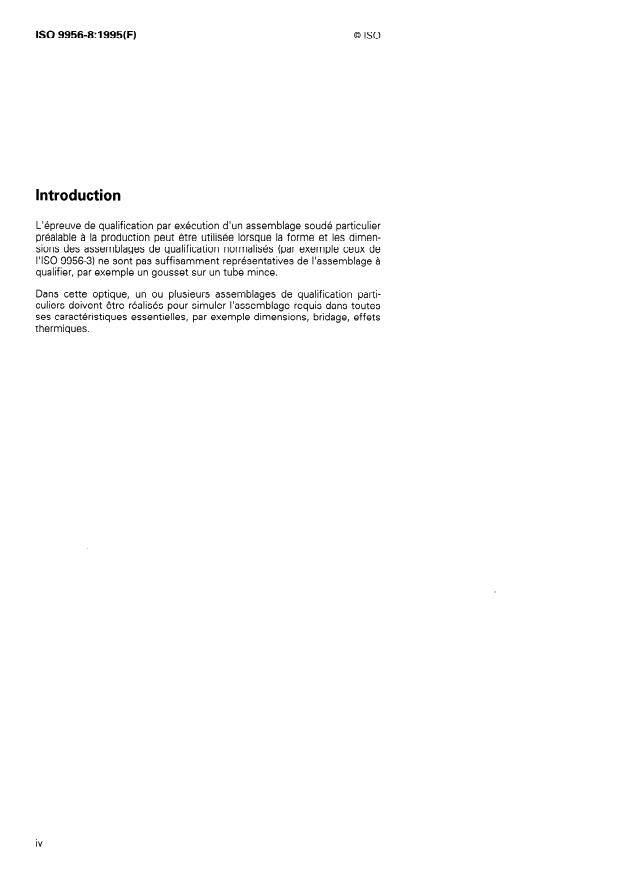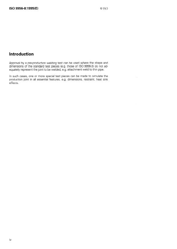 ISO 9956-8:1995 is a standard published by the International Organization for Standardization (ISO). Its full title is "Specification and approval of welding procedures for metallic materials — Part 8: Approval by a pre-production welding test". This standard covers: Describes the conditions for the approval of a fusion welding procedure of metallic materials based on pre-production welding tests. In addition, it gives the range of approval and the validity.