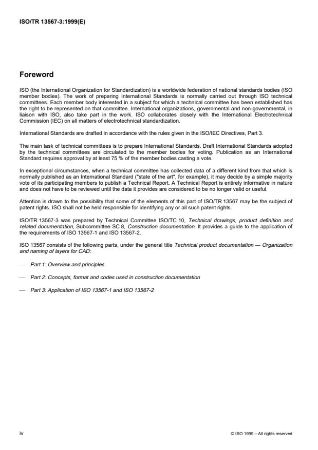 ISO/TR 13567-3:1999 is a technical report published by the International Organization for Standardization (ISO). Its full title is "Technical product documentation — Organization and naming of layers for CAD — Part 3: Application of ISO 13567-1 and ISO 13567-2". This standard covers: Technical product documentation — Organization and naming of layers for CAD — Part 3: Application of ISO 13567-1 and ISO 13567-2