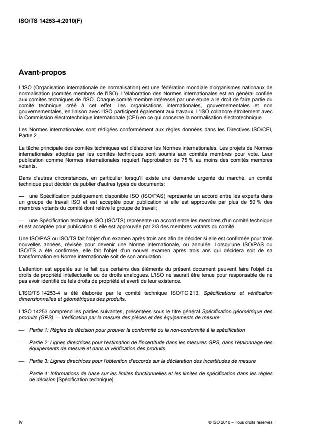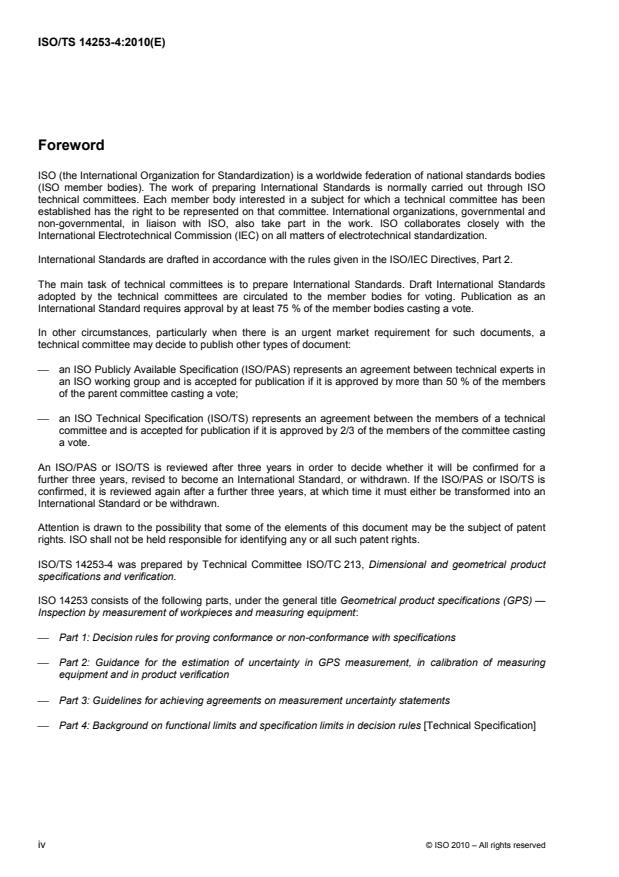 ISO/TS 14253-4:2010 is a Technical Specification in the Geometrical Product Specifications (GPS) series that explains the assumptions behind the decision rules given in ISO 14253-1. It provides background on the relationship between functional limits (what a product must deliver in use) and specification limits (the contractual limits placed on drawings and equipment specs). The document explains why the ISO/TC 213 default decision rules are theoretically ideal and what to consider before adopting alternative decision rules.