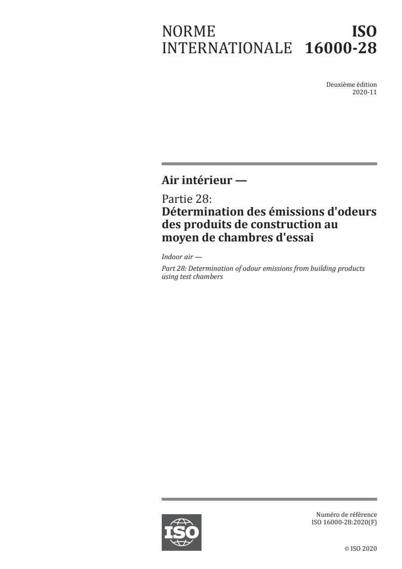 ISO 16000-28:2020 - Indoor air — Part 28: Determination of odour emissions from building products using test chambers Released:11/17/2020