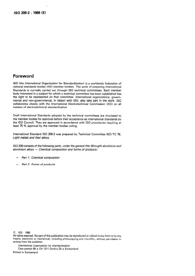 ISO 209-2:1989 is a standard published by the International Organization for Standardization (ISO). Its full title is "Wrought aluminium and aluminium alloys — Chemical composition and forms of products — Part 2: Forms of products". This standard covers: Aluminium and aluminium alloys are allocated in families according to the form of products: rolled products, extruded products, drawn products and wires. The mechanical properties and/or dimensional and form tolerances are specified in other International Standards.