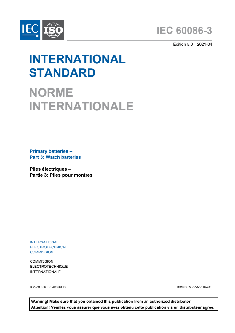 Keywords: IEC 60086-3:2021, watch batteries, primary batteries, battery dimensions, test methods, electrochemical systems, internal resistance, capacity, leakage tests, battery manufacturers, watch designers.