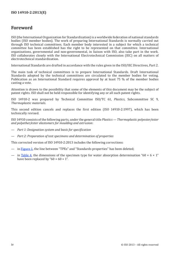 ISO 14910-2:2013 is a standard published by the International Organization for Standardization (ISO). Its full title is "Plastics — Thermoplastic polyester/ester and polyether/ester elastomers for moulding and extrusion — Part 2: Preparation of test specimens and determination of properties". This standard covers: ISO 14910-2:2013 specifies the methods of preparation of test specimens and the standard test methods to be used in determining the properties of thermoplastic polyester/ester and polyether/ester moulding and extrusion materials. Requirements for handling test material and/or for conditioning both the test material before moulding and the specimens before testing are given. Procedures and conditions for the preparation of test specimens in a specified state and procedures for measuring properties of the materials from which these specimens are made are given. Properties and test methods which are suitable and necessary to characterize thermoplastic polyester/ester and polyether/ester moulding and extrusion materials are listed.