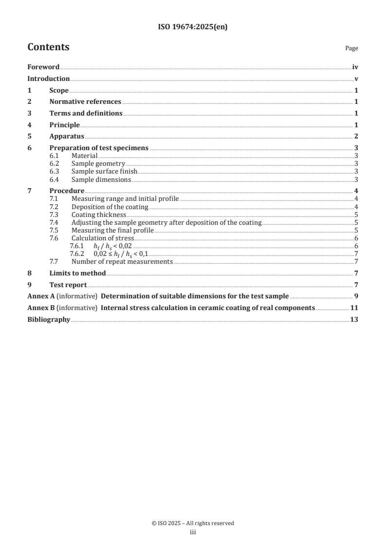 ISO 19674:2025 specifies a test method for determining the internal (residual) stress in thin ceramic coatings by applying the Stoney formula to measured changes in the radius of curvature of isotropic strip or disc specimens with a single-face coating. The method is intended for fine (advanced) ceramics and requires well-characterized substrates, accurate measurement of coating and substrate thicknesses, and careful profile measurement before and after coating.