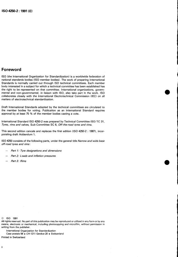 ISO 4250-2:1991 is a standard published by the International Organization for Standardization (ISO). Its full title is "Narrow and wide base off-road tyres and rims — Part 2: Loads and inflation pressures". This standard covers: Narrow and wide base off-road tyres and rims — Part 2: Loads and inflation pressures