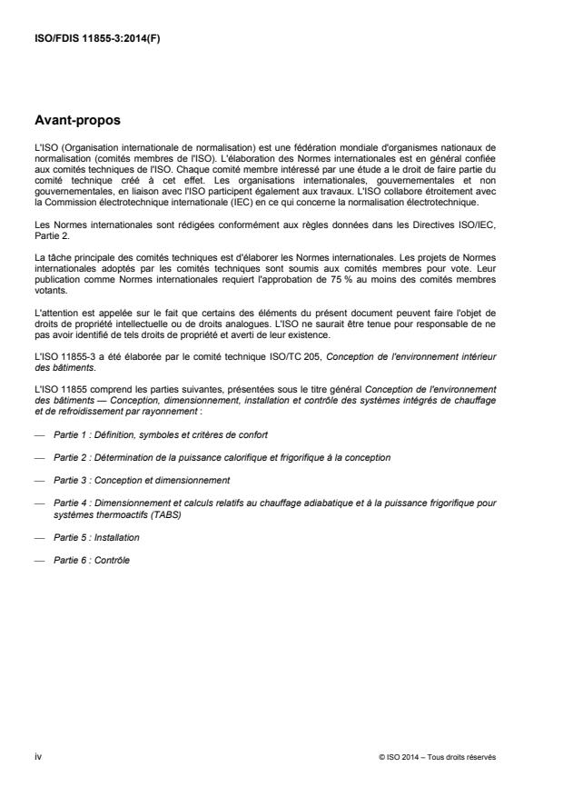 ISO 11855-3:2012 définit une méthode de conception et de dimensionnement de systèmes permettant de garantir la puissance calorifique et frigorifique des systèmes de chauffage et de refroidissement par rayonnement. La série ISO 11855 s'applique aux systèmes de chauffage et de refroidissement de surface intégrés à eau dans les bâtiments résidentiels, commerciaux et industriels. Ces méthodes s'appliquent aux systèmes intégrés dans les murs, sols ou plafonds, sans ouverture à l'air libre. Elles ne s'appliquent pas aux systèmes de panneaux avec ouvertures à l'air libre, qui ne sont pas intégrés dans une structure de bâtiment. La série ISO 11855 s'applique également, le cas échéant, à l'utilisation d'autres fluides que l'eau en tant que medium de chauffage ou de refroidissement. La série ISO 11855 ne s'applique pas à l'essai des systèmes. Ces méthodes ne s'appliquent pas aux panneaux ou poutres de plafond chauffés ou refroidis.