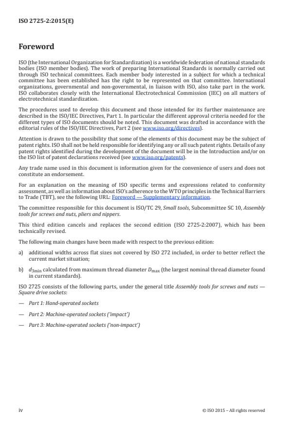 ISO 2725-2:2015 is a standard published by the International Organization for Standardization (ISO). Its full title is "Assembly tools for screws and nuts — Square drive sockets — Part 2: Machine-operated sockets ("impact")". This standard covers: ISO 2725-2:2015 specifies dimensions, designation, and marking of machine-operated "impact" square drive sockets with operating end having a hexagonal or double hexagonal form in accordance with ISO 1174‑2. NOTE 1 Machine-operated "impact" square drive sockets are listed under number 2 2 02 01 0 in ISO 1703. NOTE 2 The figures in this part of ISO 2725 are given only as examples. They are not intended to influence the manufacturer's design.