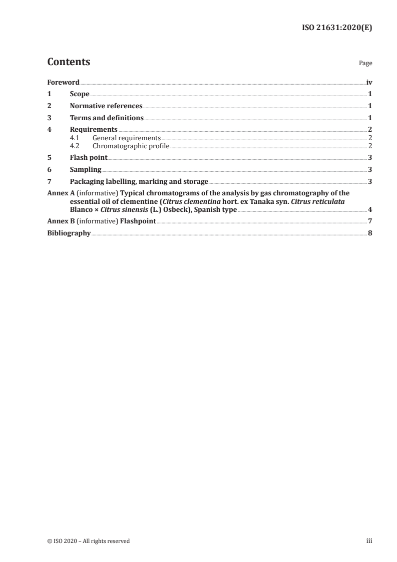 Keywords: ISO 21631:2020, essential oil of clementine, Spanish type, chromatographic profile, gas chromatography, limonene, quality assessment, flash point, sampling, refractive index.