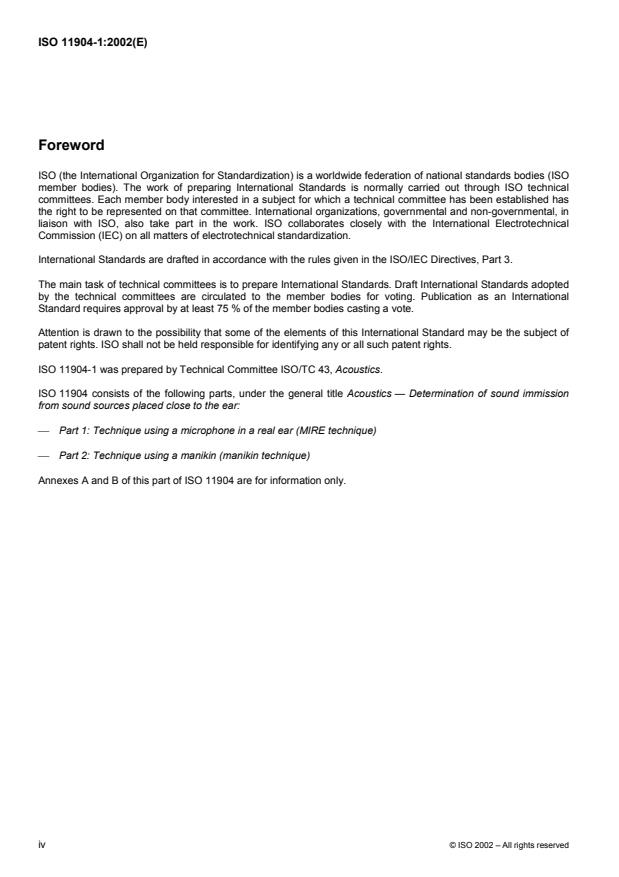 ISO 11904-1:2002 is a standard published by the International Organization for Standardization (ISO). Its full title is "Acoustics — Determination of sound immission from sound sources placed close to the ear — Part 1: Technique using a microphone in a real ear (MIRE technique)". This standard covers: ISO 11904-1:2002 specifies basic framework measurement methods for sound immissions from sound sources placed close to the ear. These measurements are carried out with miniature or probe microphones inserted in the ear canals of human subjects. The measured values are subsequently converted into corresponding free-field or diffuse-field levels. The results can be given as free-field related or diffuse-field related equivalent continuous A-weighted sound pressure levels. The technique is denoted the microphone-in-real-ear technique (MIRE technique). ISO 11904-1:2002 is applicable to exposure from sources close to the ear, for example during equipment tests or at the workplace by earphones or hearing protectors with audio communication facilities. ISO 11904-1:2002 is applicable in the frequency range from 20 Hz to 16 000 Hz.
