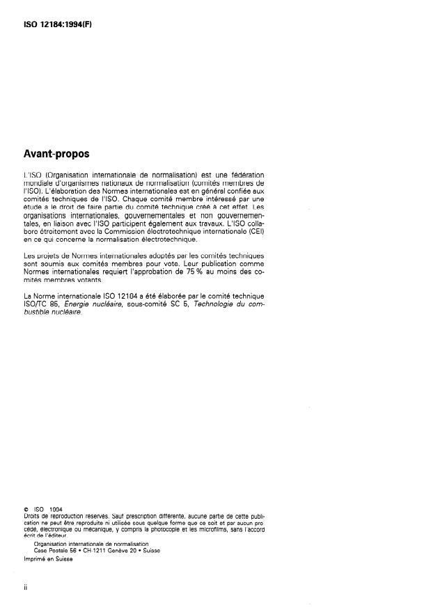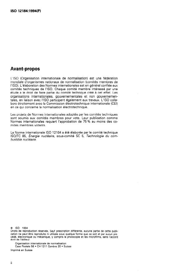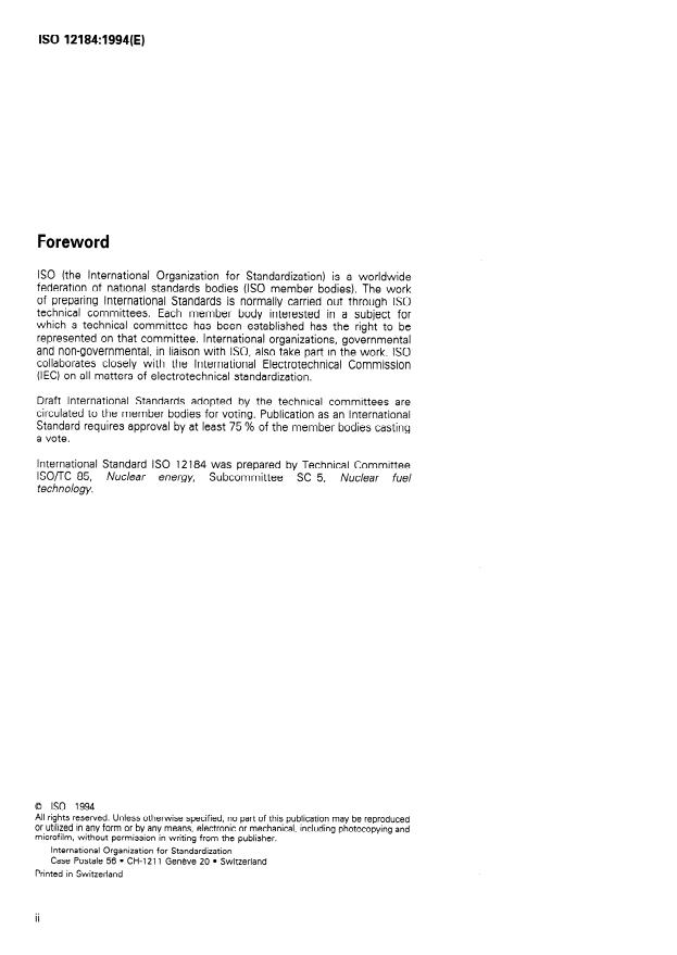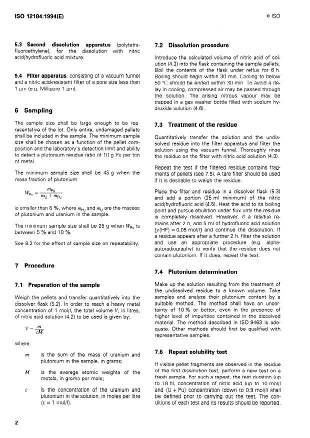 ISO 12184:1994 is a standard published by the International Organization for Standardization (ISO). Its full title is "Determination of solubility in nitric acid of plutonium in unirradiated mixed oxide fuel pellets (U,Pu)O2". This standard covers: Specifies an analytical method for determining the solubility in nitric acid of plutonium in whole pellets of unirradiated mixed oxide fuel (light water reactor fuels). The results provide information about the expected dissolution behaviour of irradiated pellets under industrial reprocessing conditions.