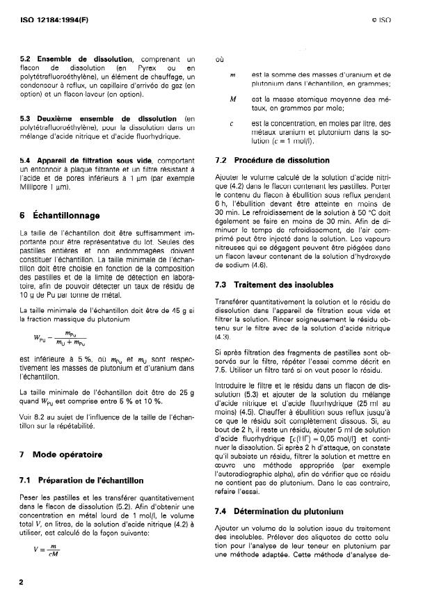ISO 12184:1994 - Détermination de la solubilité dans l'acide nitrique du plutonium des pastilles (U,Pu)O2 de combustibles d'oxydes mixtes non irradiés