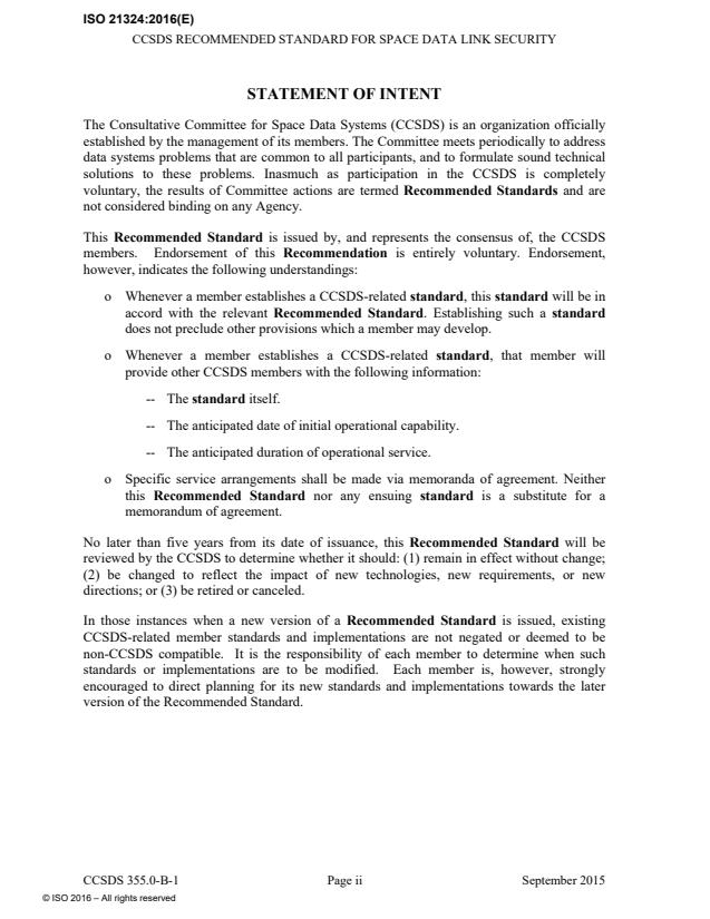The purpose of ISO 21324:2016 is to specify the Space Data Link Security Protocol (hereafter referred as the Security Protocol) for CCSDS data links. This protocol provides a security header and trailer along with associated procedures that may be used with the CCSDS Telemetry, Telecommand, and Advanced Orbiting Systems Space Data Link Protocols (references [1]-[3]) to provide a structured method for applying data authentication and/or data confidentiality at the Data Link Layer.