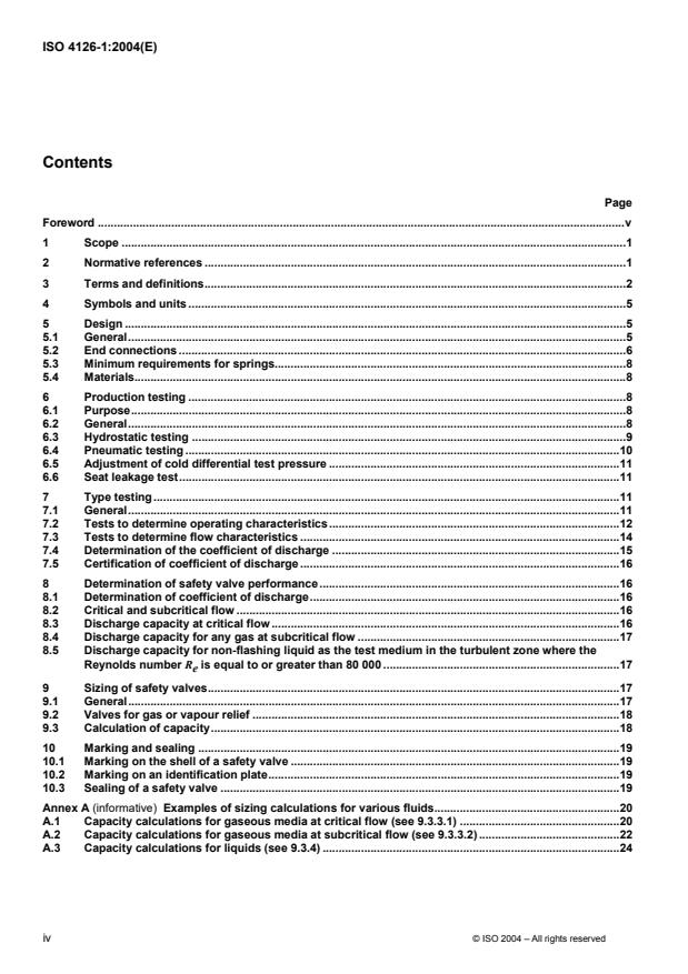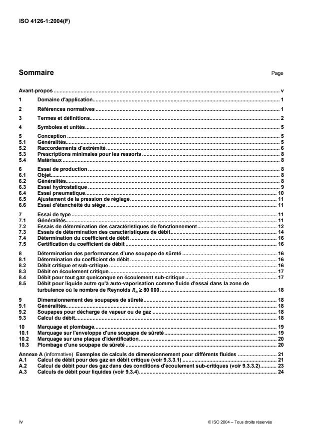 L'ISO 4126-1:2004 spécifie les prescriptions générales des soupapes de sûreté, quel que soit le fluide pour lequel elles sont conçues. Elle est applicable aux soupapes de sûreté présentant un orifice d'écoulement de diamètre supérieur ou égal à 6 mm qui sont utilisables à des pressions de début d'ouverture de 0,1 bar effectif et au-dessus. Aucune limitation en température n'est fixée. Il s'agit d'une norme de produit et elle ne s'adresse pas aux applications de soupapes de sûreté.
