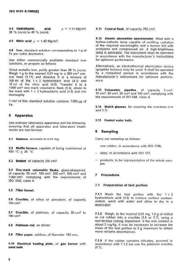 ISO 6101-5:1990 is a standard published by the International Organization for Standardization (ISO). Its full title is "Rubber — Determination of metal content by atomic absorption spectrometry — Part 5: Determination of iron content". This standard covers: Rubber — Determination of metal content by atomic absorption spectrometry — Part 5: Determination of iron content
