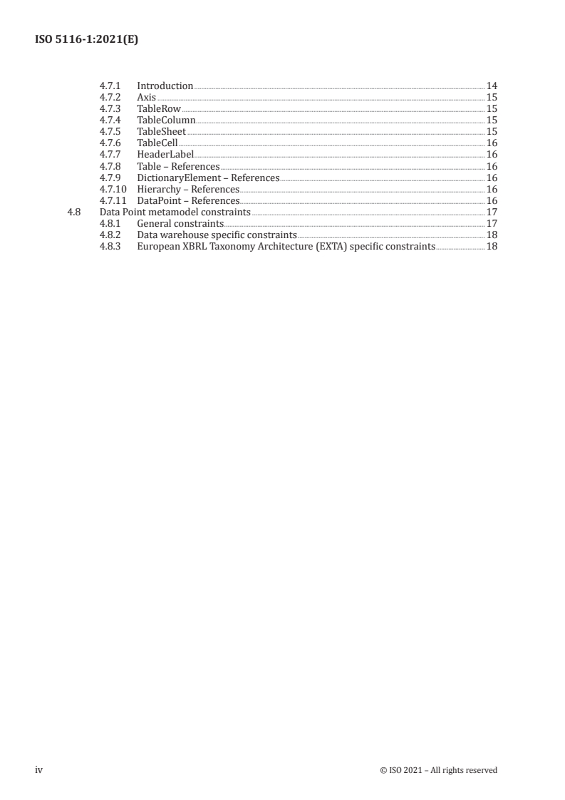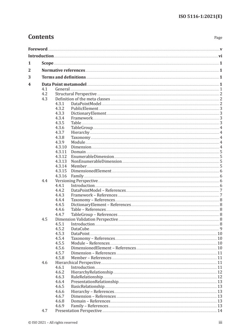 ISO 5116-1:2021 is a standard published by the International Organization for Standardization (ISO). Its full title is "Improving transparency in financial and business reporting — Harmonization topics — Part 1: European data point methodology for supervisory reporting". This standard covers: This document defines the Data Point Methodology for the creation of Data Point Models in the context of European supervisory reporting. Data Point Models are published by a European supervisory authority. To reflect the defined structures in a machine-readable form, they can be accompanied by an XBRL taxonomy. It is also possible to extend the described methodology to other environments.