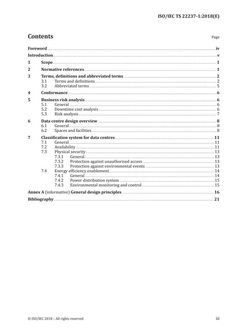 ISO/IEC TS 22237-1:2018: a) details the issues to be addressed in a business risk and operating cost analysis enabling application of an appropriate classification of the data centre; b) defines the common aspects of data centres including terminology, parameters and reference models (functional elements and their accommodation) addressing both the size and complexity of their intended purpose; c) describes general aspects of the facilities and infrastructures required to support effective operation of telecommunications within data centres; d) specifies a classification system, based upon the key criteria of "availability", "security" and "energy-efficiency" over the planned lifetime of the data centre, for the provision of effective facilities and infrastructure; e) describes the general design principles for data centres upon which the requirements of the ISO/IEC TS 22237 series are based including symbols, labels, coding in drawings, quality assurance and education. The following topics are outside of the scope of the ISO/IEC TS 22237 series: 1) the selection of information technology and network telecommunications equipment, software and associated configuration issues; 2) safety and electromagnetic compatibility (EMC) requirements (covered by other standards and regulations). However, information given in the ISO/IEC TS 22237 series may be of assistance in meeting these standards and regulations).