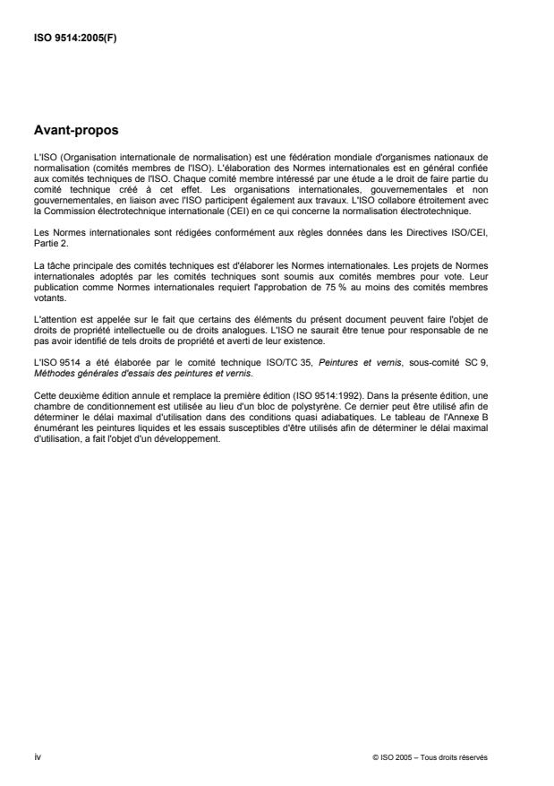 L'ISO 9514:2005 décrit une méthode, exécutée dans des contions normalisées, pour la préparation et le stockage d'un échantillon d'un système de revêtement multicomposants en vue d'évaluer son délai maximal d'utilisation après mélange par mesurage d'une ou de plusieurs propriétés particulières. La méthode peut être mise en pratique, soit sous forme d'un essai de conformité/non-conformité par détermination de la ou des propriétés données après un temps spécifié, soit sous forme de détermination du délai maximal d'utilisation par répétition des déterminations à des intervalles de temps qui conviennent. L'ISO 9514:2005 n'est pas destinée au contrôle «in situ» des produits lors de leur application. Elle est destinée à déterminer le «délai maximal d'utilisation après mélange» en laboratoire.