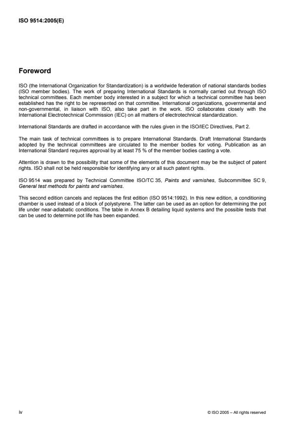 ISO 9514:2005 is a standard published by the International Organization for Standardization (ISO). Its full title is "Paints and varnishes — Determination of the pot life of multicomponent coating systems — Preparation and conditioning of samples and guidelines for testing". This standard covers: ISO 9514:2005 describes a method, carried out under standard conditions, for preparing and storing a sample of a multicomponent coating system and subsequently assessing its pot life by measuring a particular property/ies. The method can be carried out either as a pass/fail test by determining the particular property/ies after a specified period of time, or as determination of the pot life by repeating determinations at convenient intervals of time. This International Standard is not intended for in situ control of products during their application. It is intended to determine 'pot life' in the laboratory.
