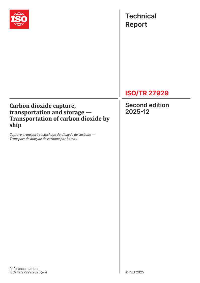 ISO/TR 27929:2025 - Carbon dioxide capture, transportation and storage - Transportation of carbon dioxide by ship is a technical report that explains the technical integration of CO2 carriers into the CCS value chain. The document focuses on the ship side of CO2 shipping between shore‑based terminals, covering how CO2 cargo characteristics and impurities affect ship design, operation and safety. Commercial, liability and financial aspects are intentionally excluded.