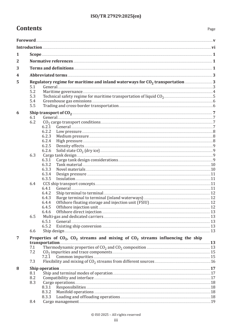 This document provides insights into the essential aspects of CO2 shipping and provides basic descriptions of how a CO2 carrier and its technology therein is technically integrated with the CCS value chain. This document describes specific challenges of transporting CO2 as cargo, how this differs from other gases transported by ships today, and how this influences the ship's design and operation. Finally, this document introduces how CO2 ships are regulated within the existing international maritime regulatory framework. This document’s main focus is on the technical aspects of CO2 shipping. Commercial, liability and financial aspects are not covered in this document. However, general reference to commercial impact is made where relevant. This document focuses on the ship transportation of CO2 between loading and offloading facilities where the system boundaries are at the ship manifold equipment that connects the ship to the other components in the value chain. In this document, the basis for the description of ship operation is transportation between two shore-based terminals. A high-level description of other relevant interfaces is given on a conceptual level as this has an impact on the ship's design. However, any further descriptions of potential solutions upstream and downstream from the CO2 carrier are not covered in this document. This document also gives a high-level description of the physical properties of CO2 streams at the conditions relevant for shipping and how relevant impurities can impact the ship and ship operation.
