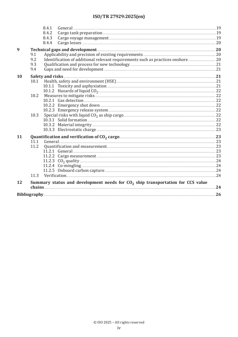 ISO/TR 27929:2025 is a technical report published by the International Organization for Standardization (ISO). Its full title is "Carbon dioxide capture, transportation and storage - Transportation of carbon dioxide by ship". This standard covers: This document provides insights into the essential aspects of CO2 shipping and provides basic descriptions of how a CO2 carrier and its technology therein is technically integrated with the CCS value chain. This document describes specific challenges of transporting CO2 as cargo, how this differs from other gases transported by ships today, and how this influences the ship's design and operation. Finally, this document introduces how CO2 ships are regulated within the existing international maritime regulatory framework. This document’s main focus is on the technical aspects of CO2 shipping. Commercial, liability and financial aspects are not covered in this document. However, general reference to commercial impact is made where relevant. This document focuses on the ship transportation of CO2 between loading and offloading facilities where the system boundaries are at the ship manifold equipment that connects the ship to the other components in the value chain. In this document, the basis for the description of ship operation is transportation between two shore-based terminals. A high-level description of other relevant interfaces is given on a conceptual level as this has an impact on the ship's design. However, any further descriptions of potential solutions upstream and downstream from the CO2 carrier are not covered in this document. This document also gives a high-level description of the physical properties of CO2 streams at the conditions relevant for shipping and how relevant impurities can impact the ship and ship operation.