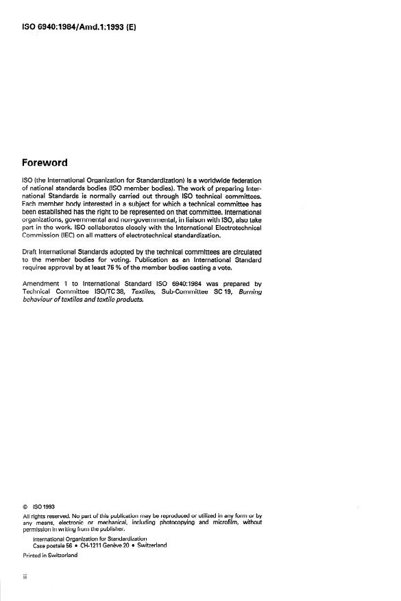 ISO 6940:1984/Amd 1:1993 is a standard published by the International Organization for Standardization (ISO). Its full title is "Textile fabrics — Burning behaviour — Determination of ease of ignition of vertically oriented specimens — Amendment 1". This standard covers: Replaces subclauses 8.3 (English only) and 8.5, item p) of clause 10, first paragraph of subclause A.2.1, and figure 3.