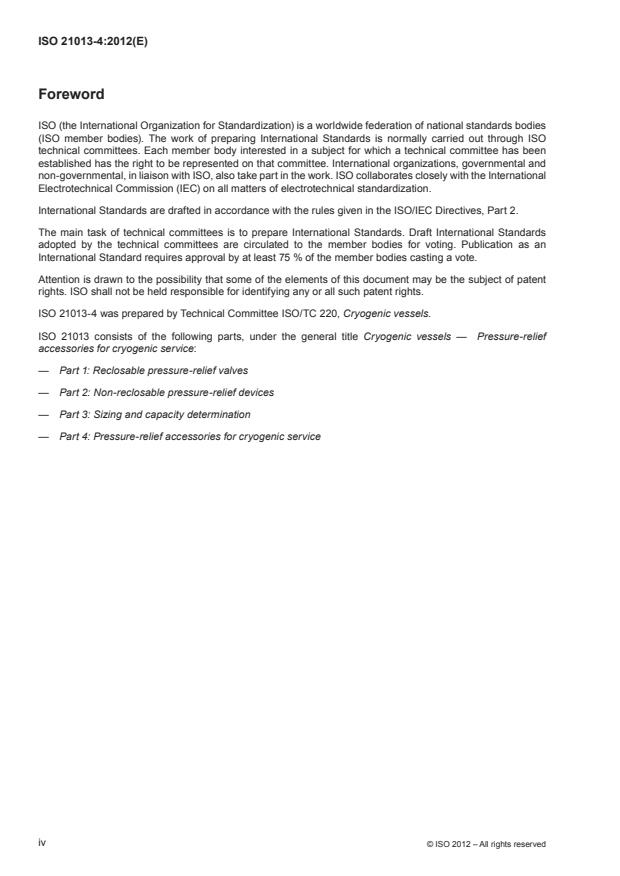 ISO 21013-4:2012 is a standard published by the International Organization for Standardization (ISO). Its full title is "Cryogenic vessels - Pilot operated pressure relief devices - Part 4: Pressure-relief accessories for cryogenic service". This standard covers: ISO 21013-4:2012 specifies the requirements for the design, manufacture and testing of pilot operated pressure relief valves for cryogenic service, i.e. for operation with cryogenic fluids in addition to operation at temperatures from ambient to cryogenic. It is restricted to valves not exceeding a size of DN 300 designed to relieve single phase vapours, gases, or mixtures of gases and/or vapours.