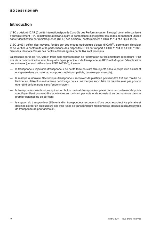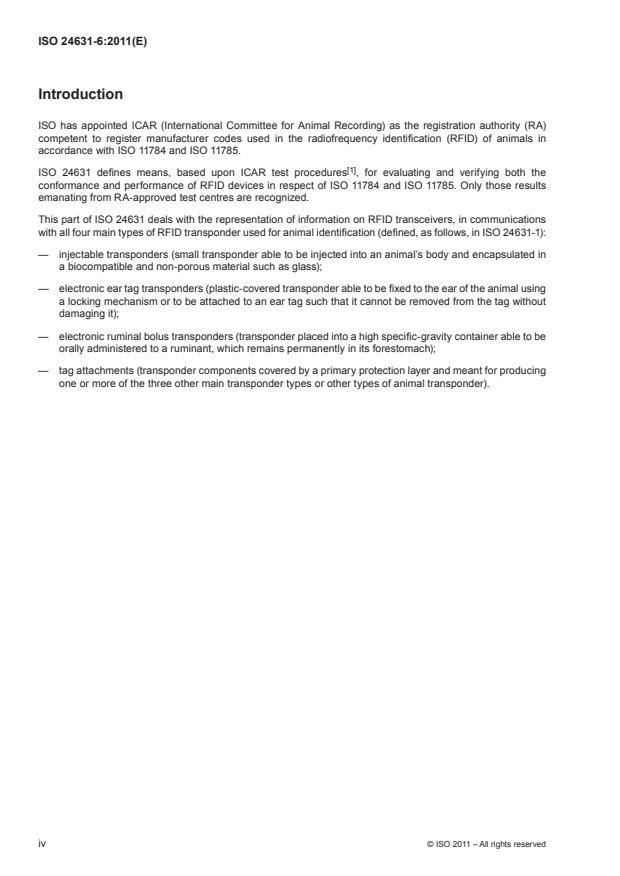ISO 24631-6:2011 is a standard published by the International Organization for Standardization (ISO). Its full title is "Radiofrequency identification of animals - Part 6: Representation of animal identification information (visual display/data transfer)". This standard covers: ISO 24631-6:2011 specifies the representation of the animal identification information specified in ISO 11784 and ISO 11785 on a transceiver display and its communication from transceivers to systems in which the information may be stored in a database, used for process control or displayed.