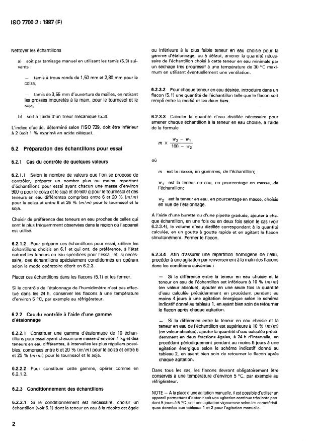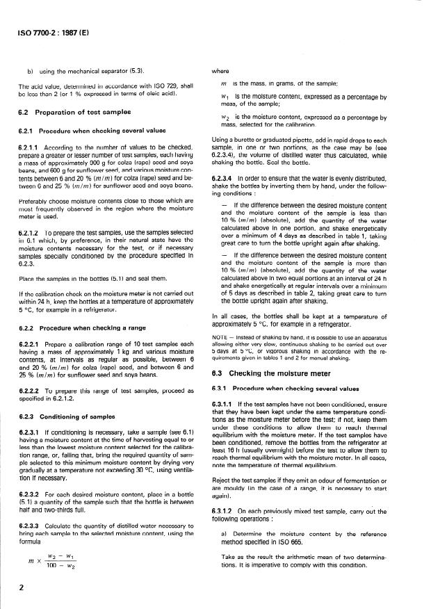 ISO 7700-2:1987 is a standard published by the International Organization for Standardization (ISO). Its full title is "Check of the calibration of moisture meters — Part 2: Moisture meters for oilseeds". This standard covers: For each specien to be tested using the meter, the methods consist in preparing of several test samples, or a range of test samples, with different moisture contents, under specified conditions, determining of their moisture contents by a reference method, and measuring with the meter to be checked. Information concerning the maximum permitted errors is given in an annex.