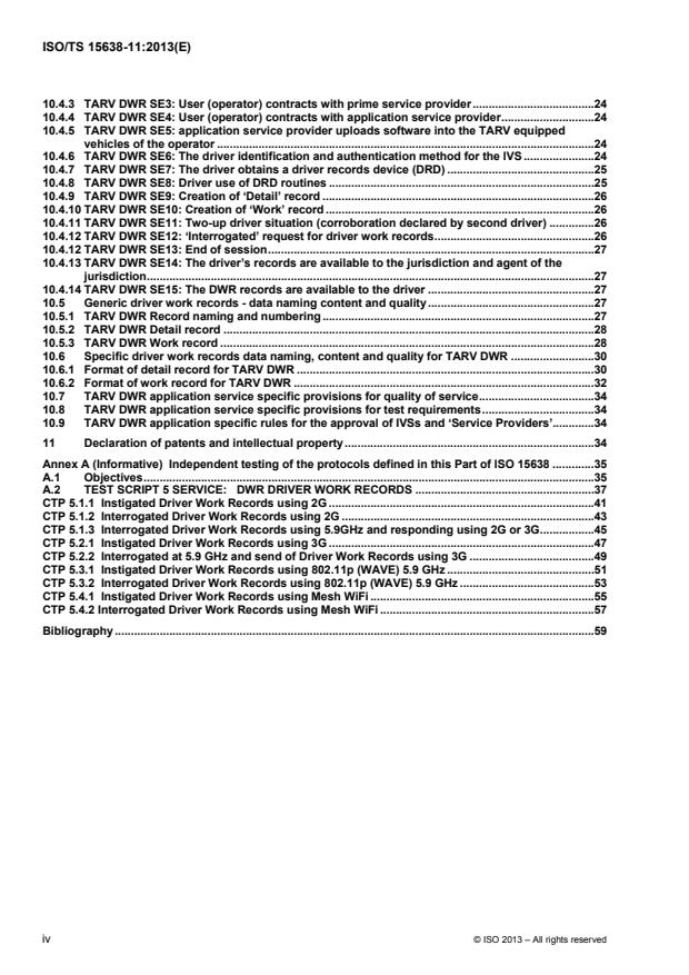 ISO/TS 15638-11:2013 is a technical specification published by the International Organization for Standardization (ISO). Its full title is "Intelligent transport systems — Framework for collaborative Telematics Applications for Regulated commercial freight Vehicles (TARV) — Part 11: Driver work records (work and rest hours compliance) (DWR)". This standard covers: ISO/TS 15638-11:2013 addresses the provision of ?Driver Work Records' and specifies the form and content of such data required to support such systems, and access methods (4.1) to that data. ISO/TS 15638-11:2013 provides specifications (4.41) for common communications and data exchange aspects of the application service (4.3) driver work records that a regulator (4.37) may elect to require or support as an option, including: a) high level definition of the service that a service provider (4.39) has to provide, (The service definition describes common service elements; but does not define the detail of how such an application service (4.3) is instantiated, not the acceptable value ranges of the data concepts defined) b) means to realise the service c) application data, naming content and quality that an IVS (4.22) has to deliver. The definition of what comprises a 'regulated' service' is regarded as an issue for national decision, and may vary from jurisdiction (4.26) to jurisdiction. This document does not impose any requirements on nations in respect of which services for regulated vehicles jurisdictions will require, or support as an option, but provides standardised sets of requirements descriptions for identified services to enable cnsistent and cost efficient implementations where instantiated. ISO 15638 has been developed for use in the context of regulated commercial freight vehicles (hereinafter referred to as ?regulated vehicles' (4.36). There is nothing, however, to prevent a jurisdiction extending or adapting the scope to include other types of regulated vehicles, as it deems appropriate.