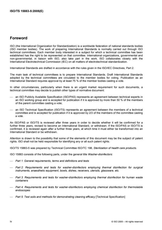 ISO/TS 15883-5:2005 is a technical specification published by the International Organization for Standardization (ISO). Its full title is "Washer-disinfectors — Part 5: Test soils and methods for demonstrating cleaning efficacy". This standard covers: ISO/TS 15883-5:2005 includes the test soils and methods that can be used to demonstrate the cleaning efficacy of washer-disinfectors (WD) according to the ISO 15883 series of standards. The inclusion of the test soils and methods in ISO/TS 15883-5:2005 does not indicate that they are of equivalent sensitivity in their determination of cleaning efficacy. Acceptance criteria are included, based on visual inspection and/or a microbiological end-point as stated for each method. Where chemical detection of residual soiling is required/sought, methods can be complemented by the specific determination of a residual component of the applied test soil. NOTE 1 The test soils and methods included in ISO/TS 15883-5:2005 are sourced from national standards and published documents submitted by member bodies of the Technical Committee preparing ISO/TS 15883-5:2005. They have been edited only to provide a uniform format within ISO/TS 15883-5:2005. NOTE 2 An example of this is the use of the peroxidase test to detect residual blood (haemoglobin) from the test soil applied to surgical instruments or flexible endoscopes (e.g. using the method described in ISO/TS 15883-5:2005). See also ISO 15883-1:2005, Annex D.