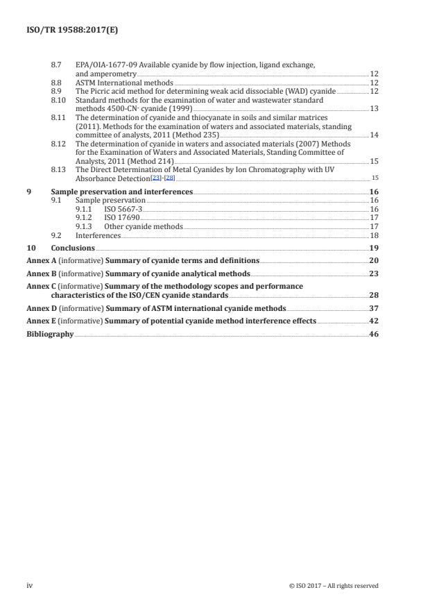 ISO/TR 19588:2017 is a technical report published by the International Organization for Standardization (ISO). Its full title is "Background information and guidance on environmental cyanide analysis". This standard covers: ISO/TR 19588:2017 provides background information on the various International (ISO), American (ASTM, EPA), and European (CEN) cyanide methods for soils, waters, effluents and wastes. It gives guidance on how to carry out fit for purpose analysis of various forms of cyanide in environmental samples, the significance of the results, how to minimize interference effects and the preservation of samples. Some information is also provided on other national and international cyanide methods.