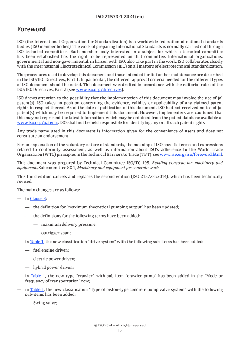 Keywords: ISO 21573-1:2024, concrete pumps, commercial specifications, concrete-mix delivery, distributing boom, piston-type pump, maximum theoretical pumping output, maximum delivery pressure, outrigger span, hydraulic system, cleaning system.