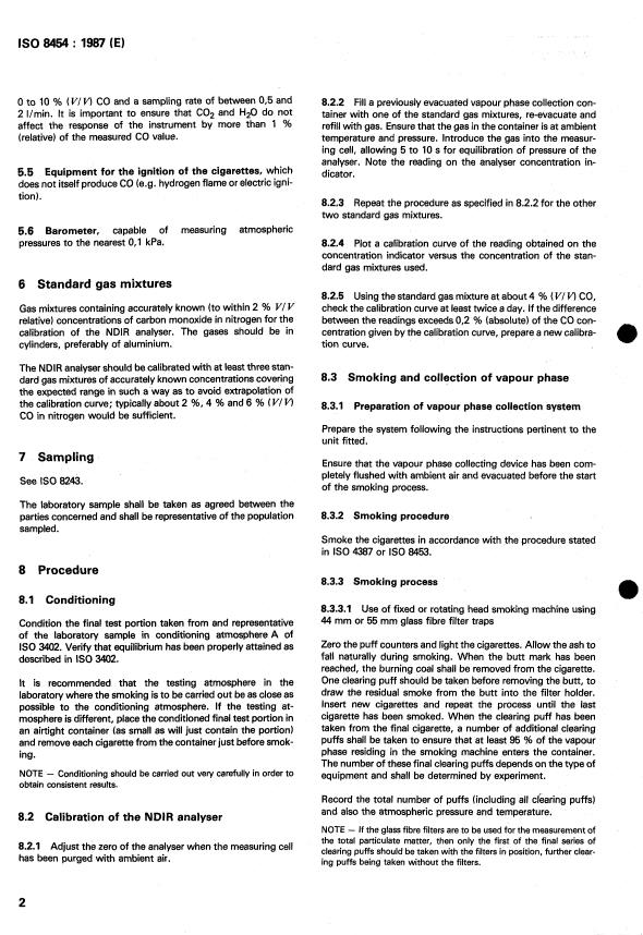 ISO 8454:1987 is a standard published by the International Organization for Standardization (ISO). Its full title is "Cigarettes — Determination of carbon monoxide in the vapour phase of smoke (NDIR method)". This standard covers: Cigarettes — Determination of carbon monoxide in the vapour phase of smoke (NDIR method)