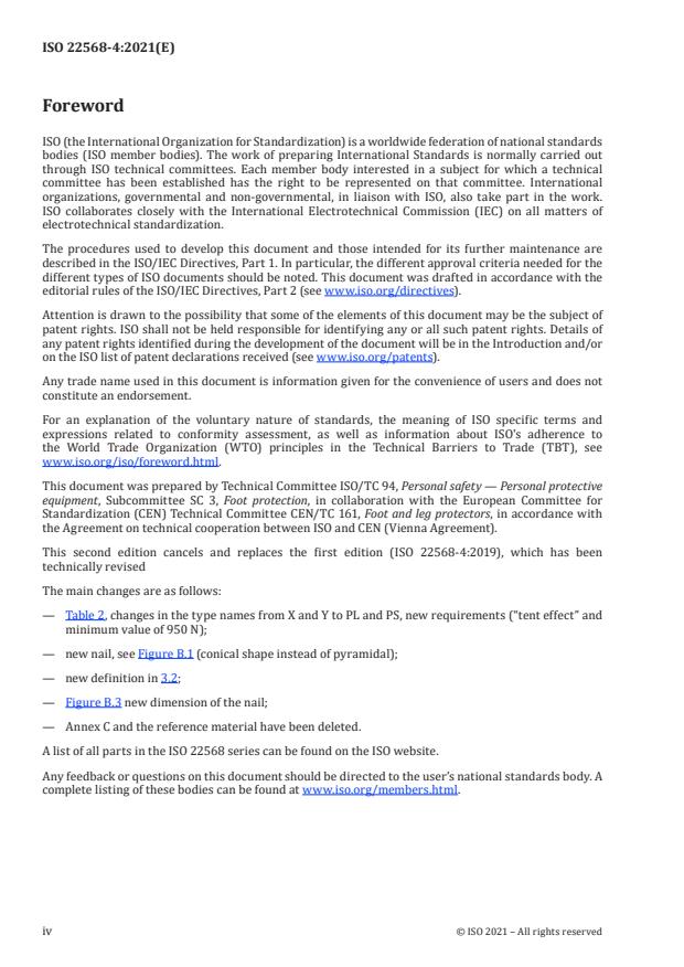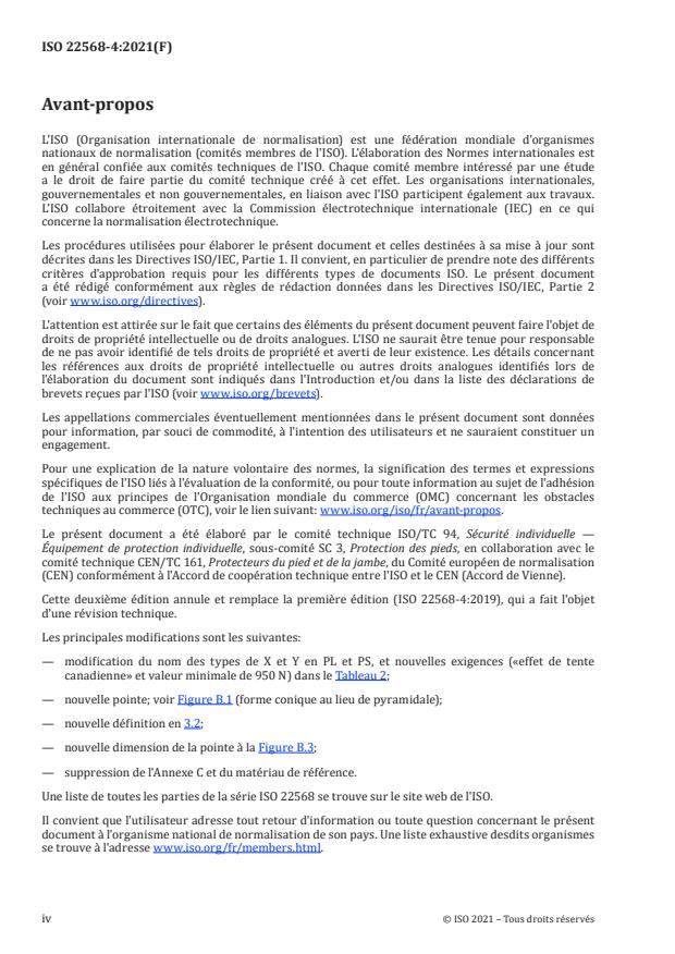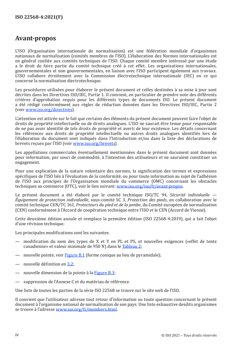 ISO 22568-4:2021 is a standard published by the International Organization for Standardization (ISO). Its full title is "Foot and leg protectors — Requirements and test methods for footwear components — Part 4: Non-metallic perforation resistant inserts". This standard covers: This document specifies requirements and test methods for the non-metallic inserts with resistance against mechanical perforation, intended to function as components of PPE footwear (e.g. as described by ISO 20345, ISO 20346 and ISO 20347).