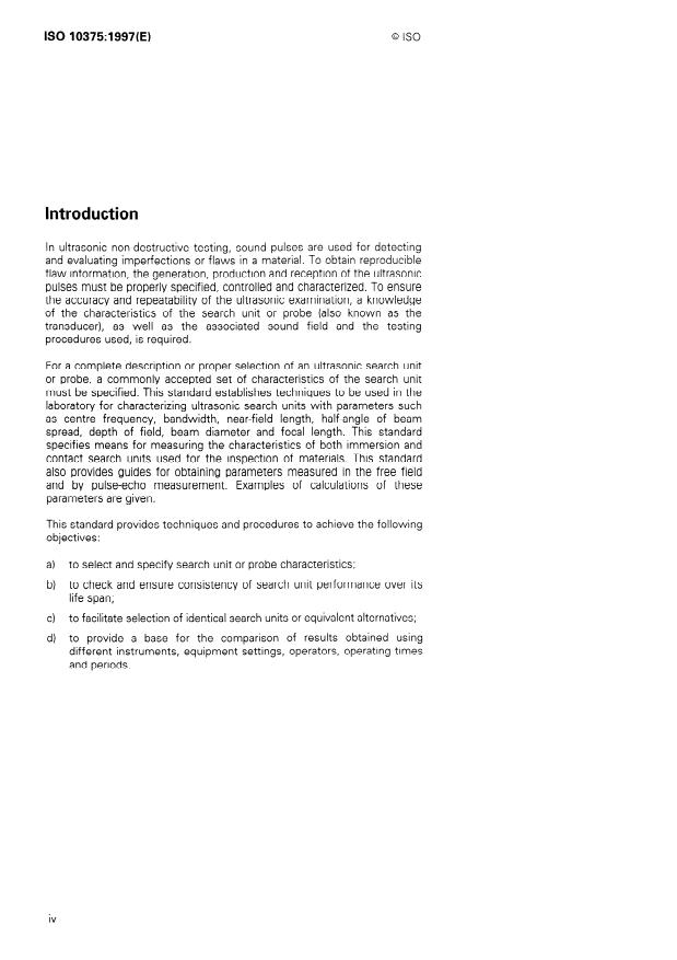ISO 10375:1997 is a standard published by the International Organization for Standardization (ISO). Its full title is "Non-destructive testing — Ultrasonic inspection — Characterization of search unit and sound field". This standard covers: Non-destructive testing — Ultrasonic inspection — Characterization of search unit and sound field