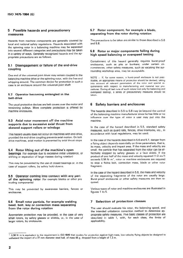 ISO 7475:1984 is a standard published by the International Organization for Standardization (ISO). Its full title is "Balancing machines — Enclosures and other safety measures". This standard covers: Specifies requirements used to minimize hazards associated with the operation of these machines under a variety of rotor and balancing conditions. Defines different classes of protection and describes the limits of applicability for each class of protection. Noise reduction, windage reduction or vacuum are not covered.