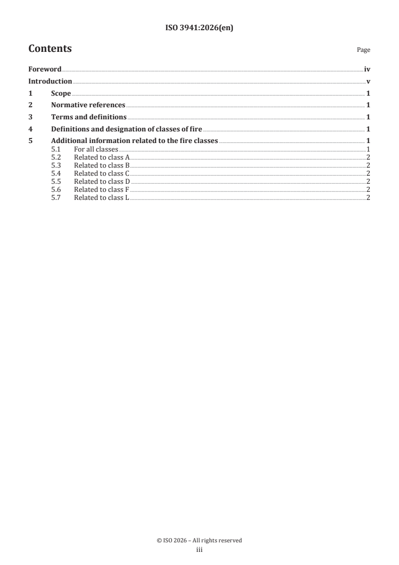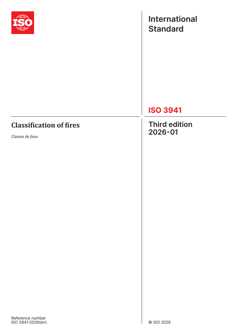 ISO 3941:2026 is a standard published by the International Organization for Standardization (ISO). Its full title is "Classification of fires". This standard covers: This document classifies, into categories, the different kinds of fires each defined by the nature of the fuel. Such a classification is particularly useful in the context of equipment for fire protection and firefighting.