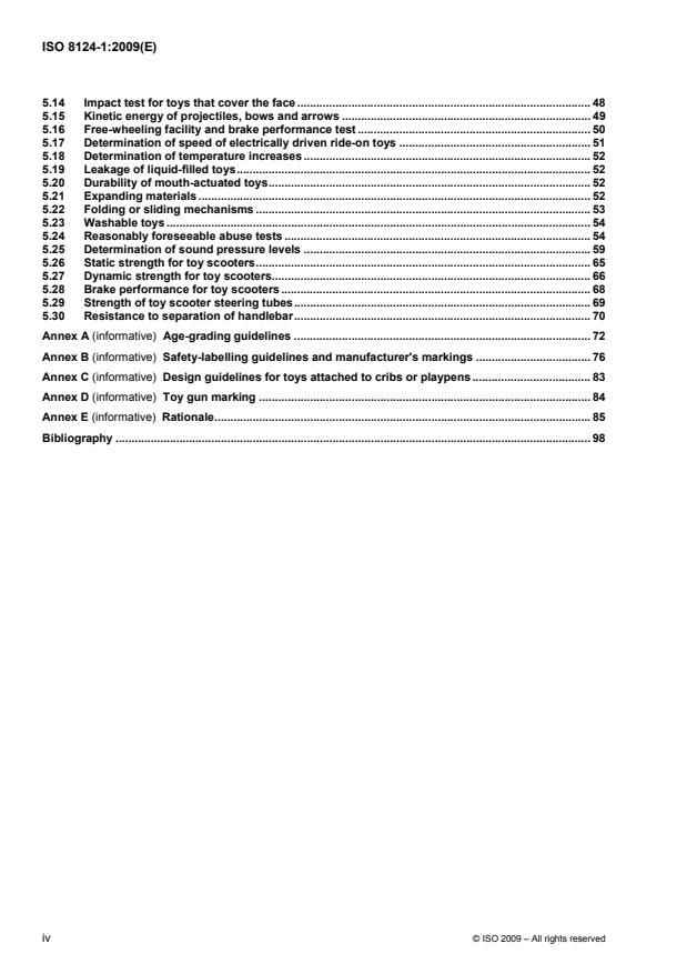The requirements in ISO 8124-1:2009 apply to all toys, i.e. any product or material designed or clearly intended for use in play by children under 14 years of age. They are applicable to a toy as it is initially received by the consumer and, in addition, they apply after a toy is subjected to reasonably foreseeable conditions of normal use and abuse unless specifically noted otherwise. The requirements of ISO 8124-1:2009 specify acceptable criteria for structural characteristics of toys, such as shape, size, contour, spacing, as well as acceptable criteria for properties peculiar to certain categories of toy. ISO 8124-1:2009 specifies requirements and test methods for toys intended for use by children in various age groups from birth to 14 years. It also requires that appropriate warnings and/or instructions for use be given on certain toys or their packaging. Due to linguistic problems that may occur in different countries, the wording of these warnings and instructions is not specified but given as general information in Annex B. It should be noted that different legal requirements exist in many countries with regard to such marking. ISO 8124-1:2009 does not purport to cover or include every conceivable potential hazard of a particular toy or toy category. Except for labelling requirements indicating the functional hazards and the age range for which the toy is intended, it has no requirements for those characteristics of toys that represent an inherent and recognized hazard that is integral to the function of the toy