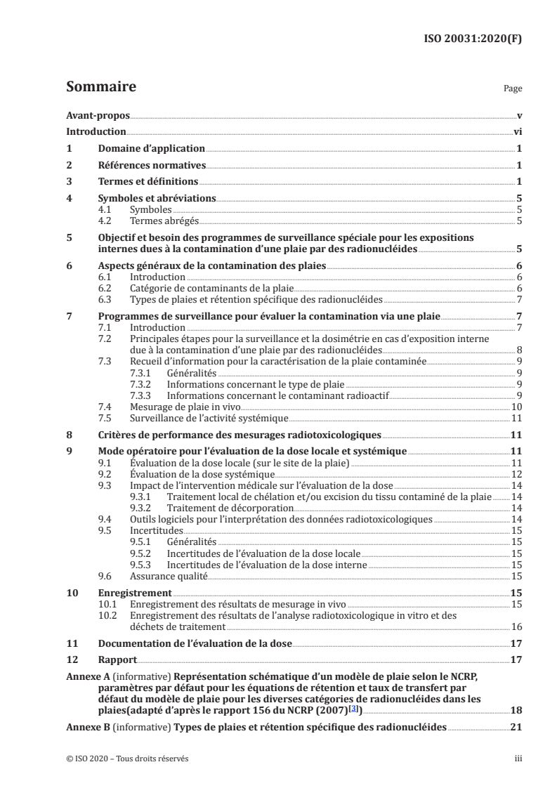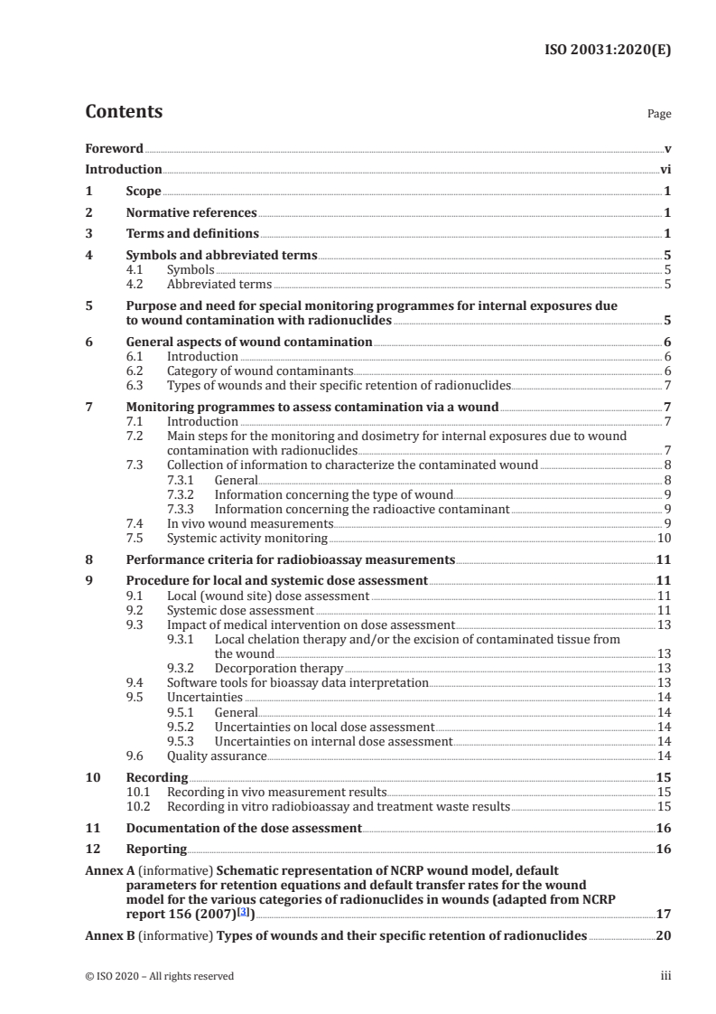 ISO 20031:2020 provides requirements and guidance for monitoring and dosimetry of internal exposures due to wound contamination with radionuclides. The standard defines how to perform personal contamination monitoring, direct measurements at the wound site, systemic uptake monitoring (bioassay), and the assessment of both local (wound site) and systemic doses following an incident. It focuses on requirements for a special monitoring programme rather than prescribing therapeutic protocols or measurement methods for specific radionuclides.