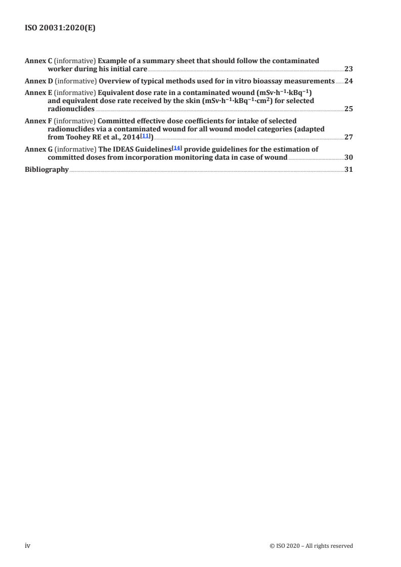 ISO 20031:2020 is a standard published by the International Organization for Standardization (ISO). Its full title is "Radiological protection — Monitoring and dosimetry for internal exposures due to wound contamination with radionuclides". This standard covers: This document specifies the requirements for personal contamination monitoring and dose assessment following wounds involving radioactive materials. It includes requirements for the direct monitoring at the wound site, monitoring of uptake of radionuclides into the body and assessment of local and systemic doses following the wound event. It does not address: — details of monitoring and assessment methods for specific radionuclides; — monitoring and dose assessment for materials in contact with intact skin or pre-existing wounds, including hot particles; — therapeutic protocols. However, the responsible entity needs to address the requirements for decontamination and decorporation treatments if appropriate.