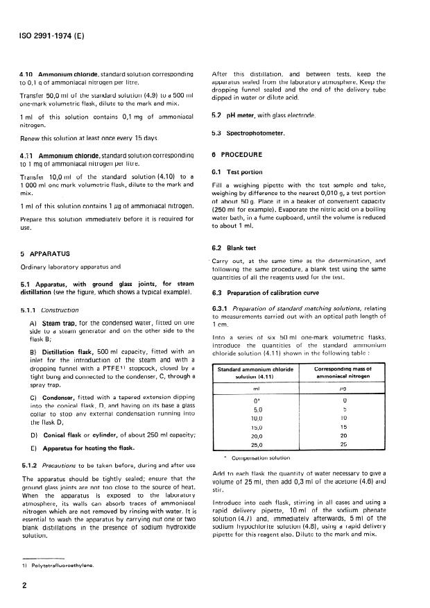 ISO 2991:1974 is a standard published by the International Organization for Standardization (ISO). Its full title is "Nitric acid for industrial use — Determination of ammoniacal nitrogen content — Spectrophotometric method". This standard covers: Applicable to products containing more than 0.0001 % (m/m) of ammoniacal nitrogen. The procedure described is siutable for contents between 0.0001 % (m/m) and 0.0005 % (m/m). The principle of the analysis consists in distillation, with entrainment by steam, of the ammonia in the presence of an excess of sodium hydroxide and collection of the distillate in an excess of acid solution. Neutralization of the excess of acid and formation of the coloured complex by treatment with sodium phenate and sodium hypochlorite in the presence of acetone. Spectrophotometric measurement of the indophenol obtained at a wavelength of about 630 nm. Has also been approved by the IUPAC.
