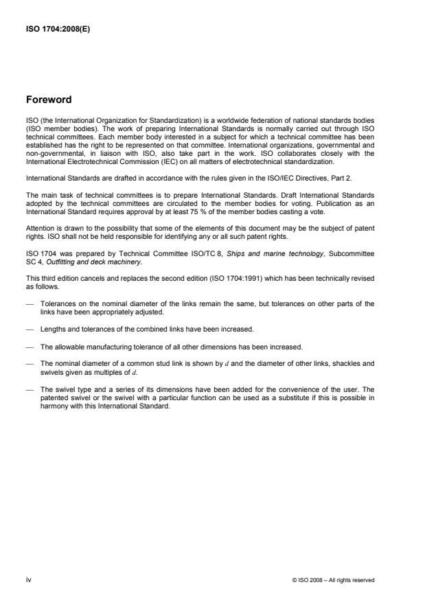 ISO 1704:2008 specifies the shape, proportions, dimensions and tolerances of the component parts of stud-link anchor chains. Any statutory requirements, rules and regulations applicable to the individual ship concerned also apply.